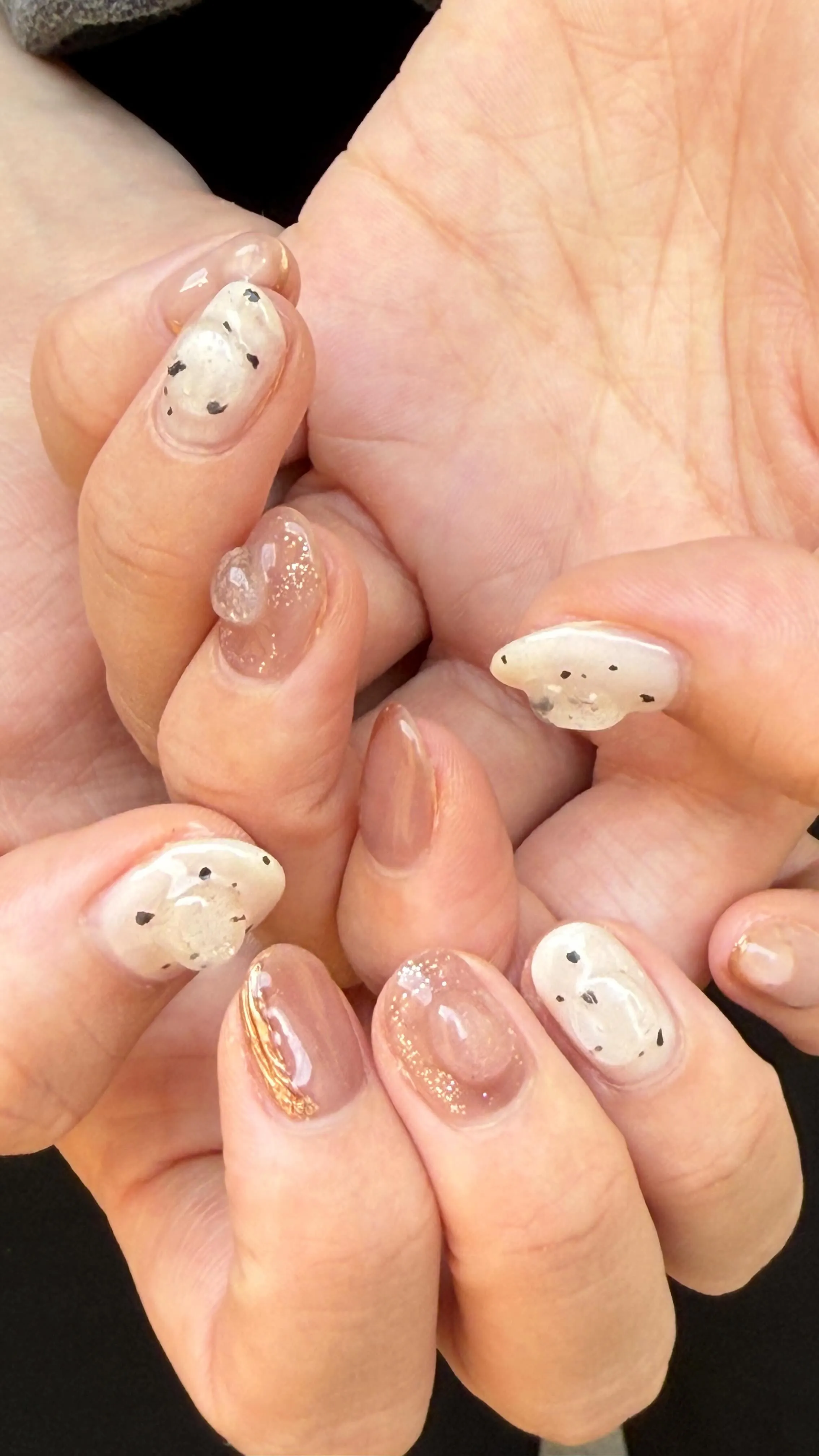 数年振りに何度目かのお持ち込みデザイン☺️ 数年振りに何度目かのお持ち込みデザイン☺️いつもありがとうございます!!数年前は黒い粒々がお店になくて、一個ずつ手書きしてたよね〜って懐かしい話🤭#下北沢ネイル#paragel#パラジェル#下北沢ネイル…